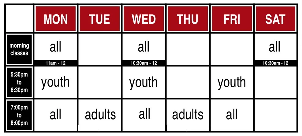 All levels: Monday - 11AM, 7PM; Tues/Thurs - 7:00PM; Wednesday - 10:30AM, 7PM; Friday - 7PM; Saturday - 10:30AM